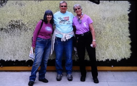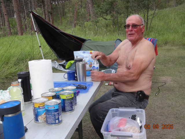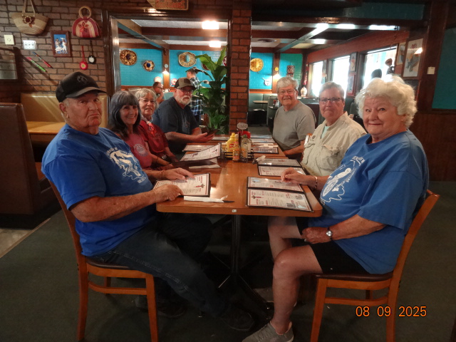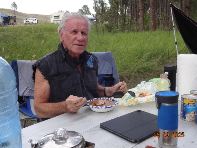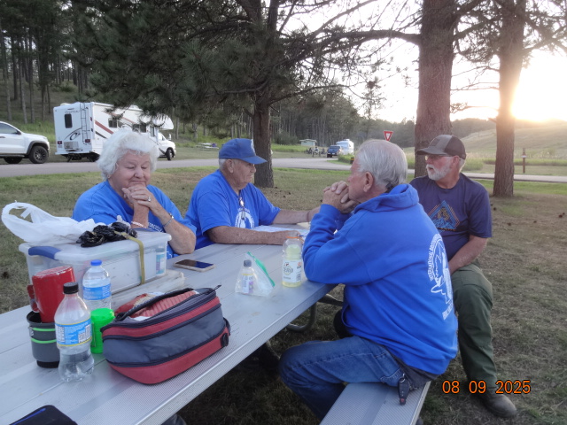 We’re a group of a dozen travelers. Most arrived a day early on Wednesday, August 6th. First timers were Robin Petrovsky (AZ), Steve and Sao Kastel (NV), Dave Christiansen (NV), and James Langley (AL). Jim and Nancy Murphy (AZ) last visited Wind Cave campout in 2019. Other members ambled in on Thursday and Friday: Desse Johnson (IA), Chuck Ribideaux (MN), and James Stewart (CO). At a young 90 years of age, Jim Poitra from Chadron, Nebraska rode in for a visit with all of us on Friday. We had one guest who joined us, Barry First, that we made welcome and tried to recruit into IBMC. He was riding the country from Baltimore, MD with tent and gear. Most all made the usual attractions in South Dakota: Rushmore, Sturgis, Wind Cave tours, Hill City scenic train ride, Needles Highway, Custer Park. A large herd of bison were observed by some of the lucky while riding. Though no campfires were allowed, warm weather and our circle of camp chairs provided the necessary ingredients for catching up and telling new stories each night. As Chuck tried to setup his tent on Thursday, a slight wind almost sent his tent into the creek and over the hill. It took about 4 people to lasso and restrain his escapee. Another camp experience was James (Langley’s’) camp trailer which tried to oust him out of bed at 6am. Much to his alarm and surprise the trailer tongue went air borne. Robin and Carla Sartwell (AZ), first on the scene, took quick action to stabilize the malfunctioning tent trailer. A group lunch was held at Maria’s in the town of Custer on Saturday. Many epicurean menu items were devoured. It was a delight to see our friends again. Some of us only see each other once a year at this campout. Join us next year, same place, same loop B but, a week later. Keep on riding!
